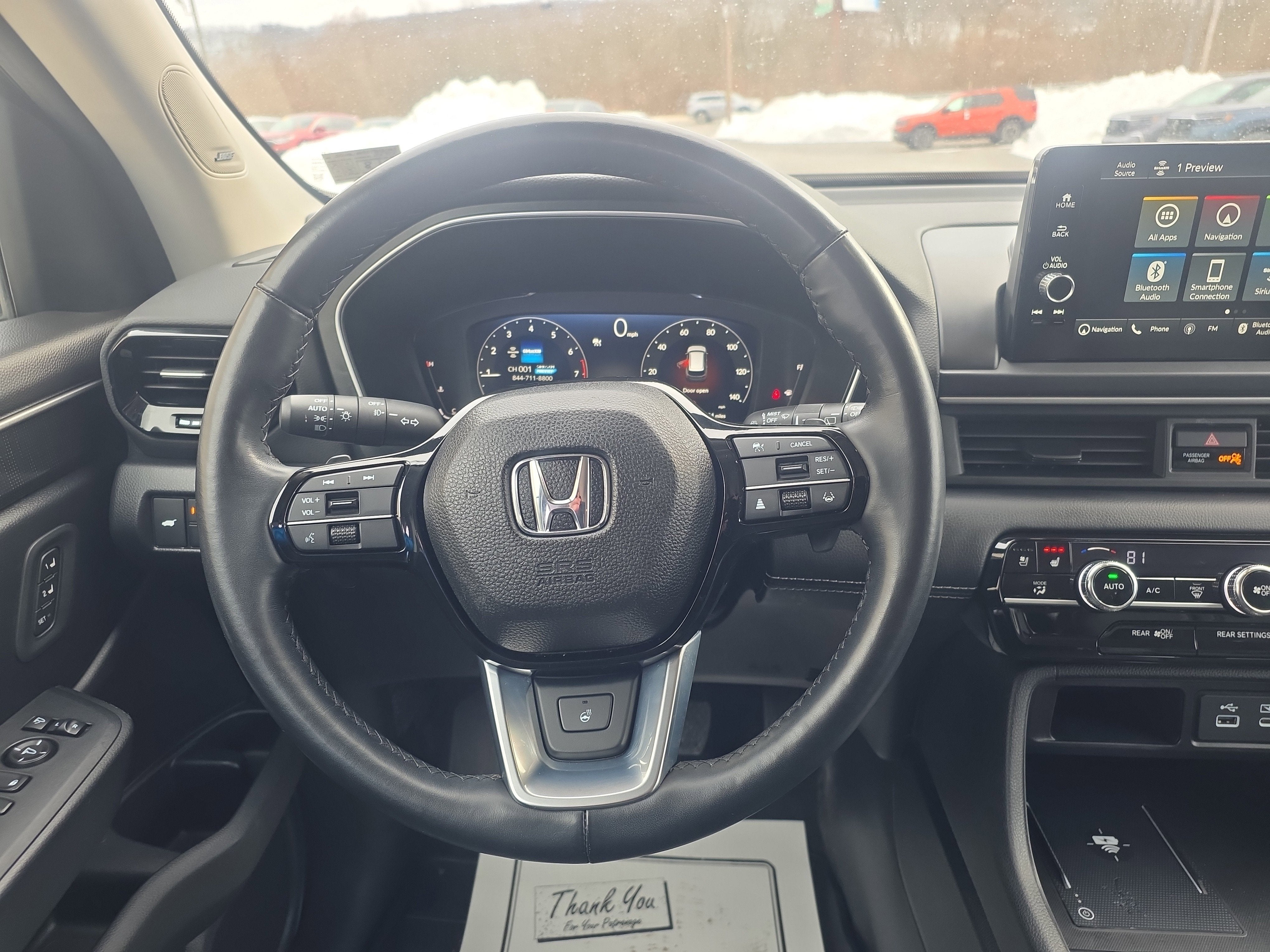 - Radio: Bose Premium Sound System -inc: 12 speakers w/subwoofer, 9" color touchscreen, Bluetooth® HandsFreeLink and streaming audio, Radio Data System (RDS), Speed-sensitive Volume Compensation (SVC), front 12-volt power outlet, wireless Apple CarPlay and Android Auto compatibility, Wi-Fi hotspot capability, Qi wireless phone charger, SMS text message function, SiriusXM (SiriusXM requires a subscription after any trial period, If you decide to continue your SiriusXM service at the end of your trial subscription, the plan you choose will automatically renew and bill at then-current rates until you call SiriusXM at 1-866-635-2349 to cancel, See our customer agreement for complete terms at www.siriusxm.com, Fees and programming subject to change, Available in the 48 contiguous United States and D.C, SiriusXM and all related marks and logos are trademarks of SiriusXM Radio Inc.), HD Radio, 2.5-amp USB type-A smartphone/audio interface port in front console, 3.0-amp USB type-C charging port in front console, Honda Satellite-Linked Navigation System w/voice recognition and Honda Real-Time Traffic (The Honda Satellite-Linked Navigation System functions in the United States (not including territories, except Puerto Rico) and Canada, Honda HD Digital Traffic service is only available in the United States, except Alaska, Please see your Honda dealer for details.), HondaLink subscription services ( complimentary trials of security for 1 year and a remote/concierge trial for 3 months, Enrollment is required to access the remote/concierge trial and to access certain features of security, At the end of each trial period, purchase of a subscription is required to continue the respective services.), multi-zone audio and CabinTalk in-car PA system